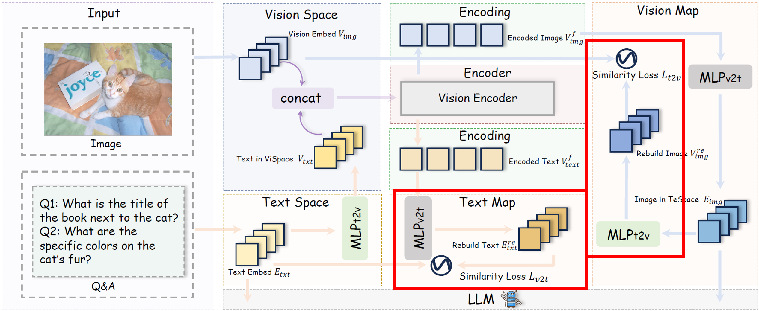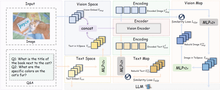마지막으로 Dual-Supervised Semantic Mapping Loss (DSM)는 vision-text 간 의미 정렬을 강화하기 위해 도입된다. 두 개의 MLP mapping 함수들을 통해 시각 임베딩과 텍스트 임베딩을 서로의 공간으로 투영하고, 다음과 같은 cosine similarity 기반의 복원 손실을 계산한다. cosine similarity loss는 이미지와 텍스트가 동일한 의미 표현을 공유하도록 유도하고 modality 간의 표현 정렬 품질을 높인다.