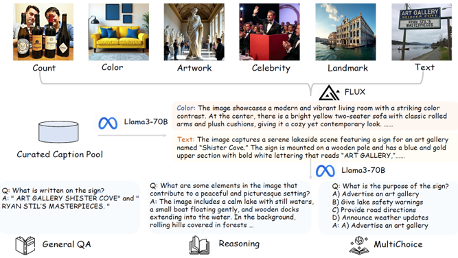 생성된 이미지와 caption을 바탕으로 다양한 유형의 QA (객관식, reasoning 등) 생성