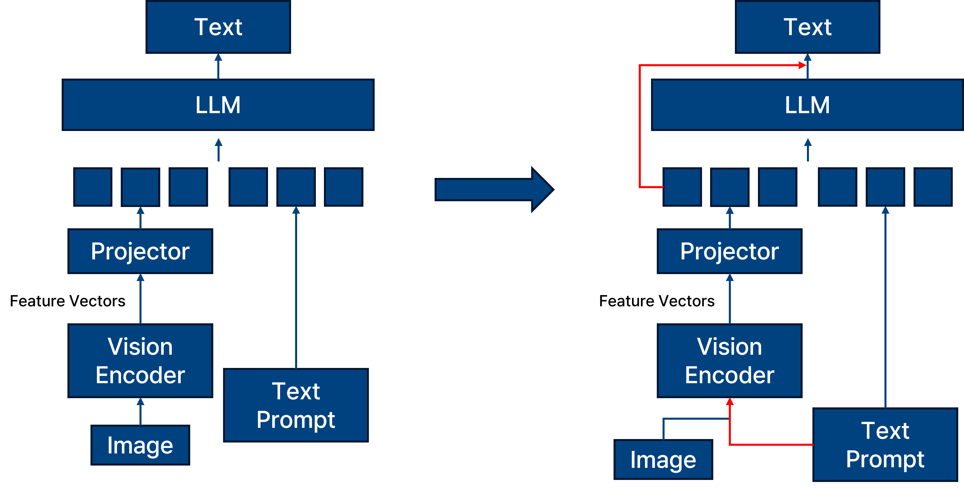 일반적인 fusion 기법을 사용하는 왼쪽 모델과 비교해 보았을 때, 오른쪽에 제안하는 프레임워크는 vision encoder에 이미지 정보와 텍스트 정보를 동시에 넣고 decoding 시에도 이미지 정보를 계속해서 반영하는 모습일 보인다.