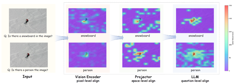 Pixel-level: Vision encoder 내부에서 이미지 패치와 질문 내 핵심 단어 간의 attention을 시각화한 결과이다.