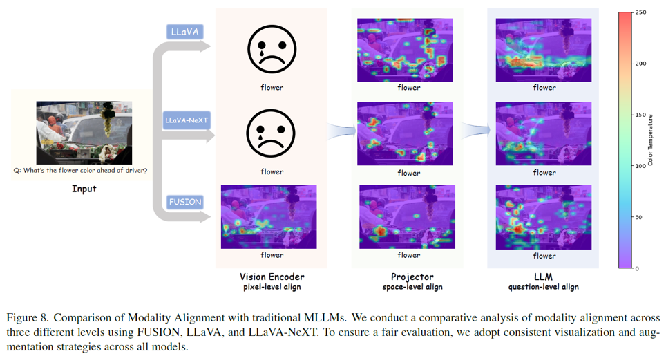 우선 LLaVA와 같이 일반적인 멀티모달 모델들은 fusion을 LLM의 입력 전 단계에서 진행하는 later fusion을 진행하기 때문에 vision encdoer에 대한 visualization 즉 pixel-level align 단계의 visualization이 불가능하다. 이는 text 정보가 vision encoder에 입력되지 않기 때문이다.