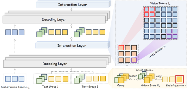 이후 LLM의 decoding 과정에서 Context-Aware Recursive Alignment Decoding (CARD)이 작동한다. 디코딩 중 각 질문 토큰의 hidden state는 context-aware query를 생성하며, 이는 vision token들과 windowed self-attention을 통해 상호작용한다. 여기서 windowed self-attention은 전체 이미지 feature에 대해 attention을 계산하는 대신, 각 vision token이 지정된 국소 윈도우 내의 토큰들만 참고하도록 제한한다. 이 방식은 연산량을 줄이고, 지역적인 정보를 더 정확하게 반영할 수 있다. 예를 들어 특정 위치의 vision token의 경우, attention은 전체 토큰이 아니라, 윈도우 내 토큰에 대해서만 계산된다. 또한 전체 이미지에 대한 전반적인 요약 정보를 유지하기 위해 global vision token도 추가적으로 decoding layer에 주입된다. 이 구조는 디코딩의 각 단계마다 관련된 vision 정보를 반복적으로 정렬하며 reasoning을 보조한다.