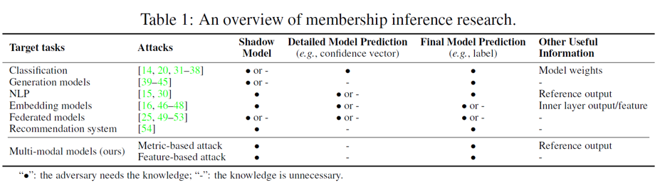 \[F_i = f_i(i_i),\quad F_t = f_t(t_i),\quad z_i = F_i - F_t\]이때 $z_i$를 입력으로 받아 binary classification을 수행하는 attack model $M_{\text{attack}}$을 학습한다.