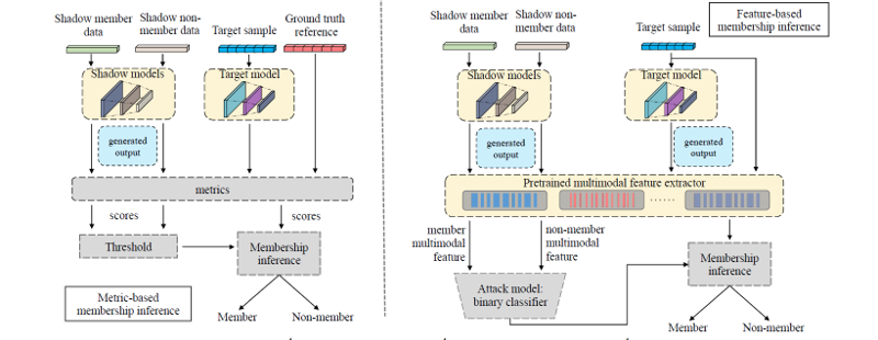 멀티모달 모델들은 일반적으로 출력값이 텍스트이기 때문에 기존의 membership inference attack (MIA) 방식인 confidence score 기반 접근법을 적용하기 어렵다. 기존 MIA는 모델의 confidence vector 또는 예측 score 등의 정량적 정보에 의존해 학습 데이터의 포함 여부를 판단하기 때문이다. 이에 본 논문은 멀티모달 모델에 대한 최초의 MIA 기법을 제안하며, metric-based와 feature-based 두 가지 공격 방법론을 제시한다.