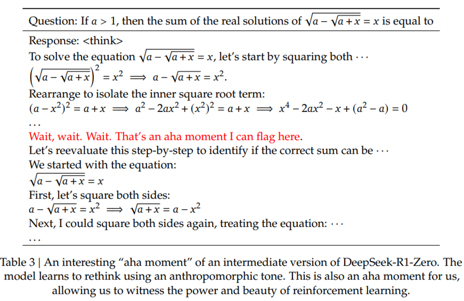 특히 학습 중 특정 시점에서 추론 성능이 급격히 향상되는 “Aha Moment”가 발생하는 것이 관찰되었다. 이는 모델이 스스로 문제 해결의 규칙을 발견하고, 이후 비슷한 문제를 더 쉽게 해결할 수 있게 되는 시점을 의미한다.