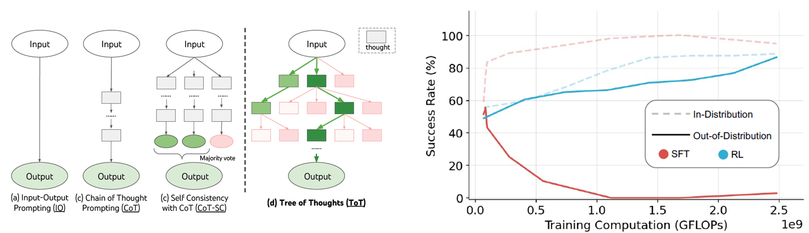 출처 : Yao, Shunyu, et al. “Tree of thoughts: Deliberate problem solving with large language models.” Advances in Neural Information Processing Systems 36 (2024). Chu, Tianzhe, et al. “SFT Memorizes, RL Generalizes: A Comparative Study of Foundation Model Post-training.” arXiv preprint arXiv:2501.17161 (2025).