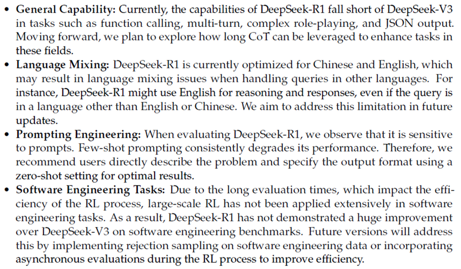 DeepSeek-R1은 강력한 추론 성능을 지니고 있음에도 불구하고 몇 가지 한계를 가진다