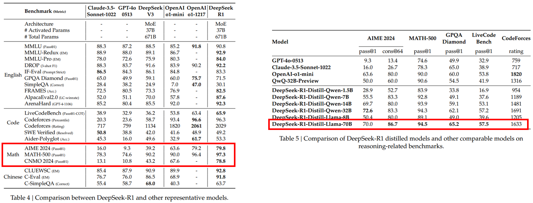 DeepSeek-R1은 다양한 추론 벤치마크에서 OpenAI o1 모델과 유사한 수준의 성능을 기록하였다. 특히 수학, 과학, 코딩과 같은 논리 추론 task에서 강화학습 기반 self-evolution 구조가 탁월한 성능을 보였다.